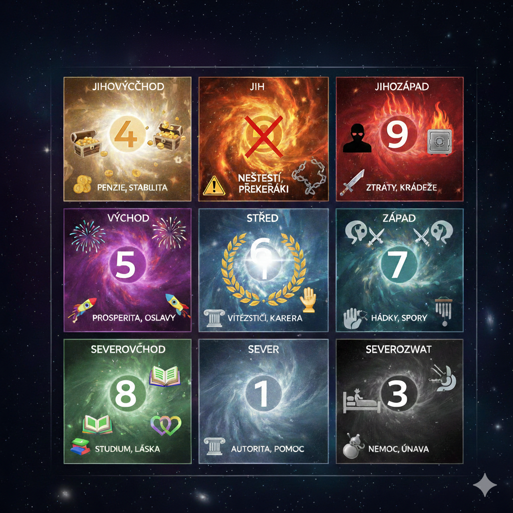 sektorech, kde sídlí negativní hvězdy a energie, aby se neutralizovala rizika